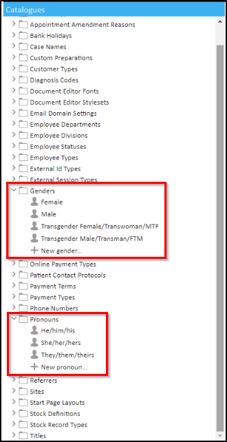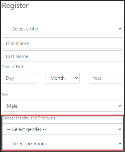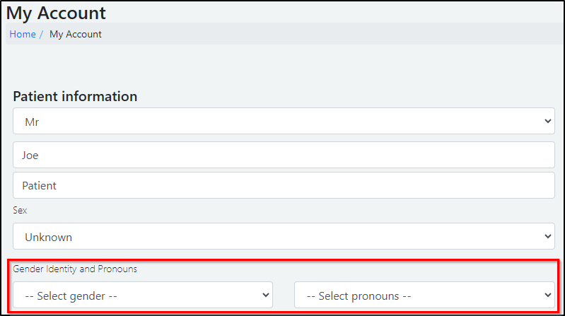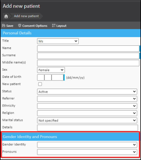 The view of Gender Identity and Pronouns will now be the default setting in your chamber when you are inputting patient details, and it will be presented as follows:
