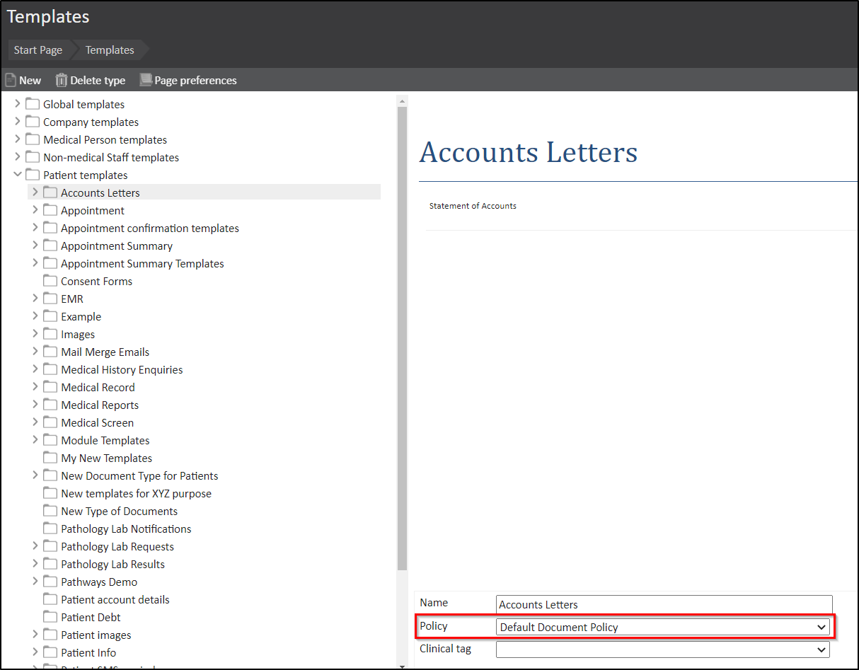 Every Document Type (Start Page > Templates) and individual Documents (Records - Patient, Company, Medical Person) has a Policy dropdown that allows selecting/changing the certificate.