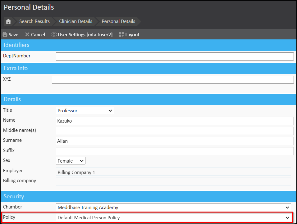 Every Medical Person (Clinician) has a Personal Details page where you can find a Security section. The Policy dropdown allows selecting/changing the certificate.