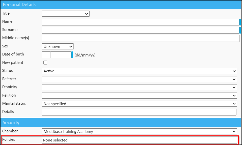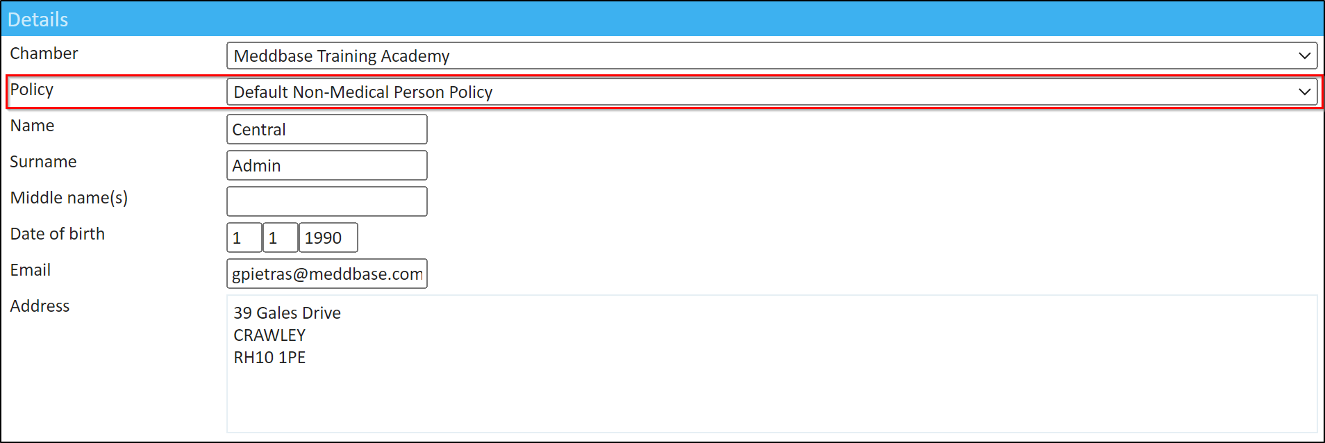 Every Non-medical staff person (non-clinician) has a Personal Details page where you can find a Details section. The Policy dropdown allows selecting/changing the certificate.