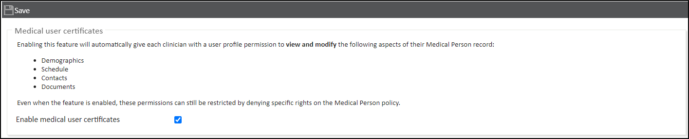 *Even when the feature is enabled, these permissions can still be restricted by denying specific rights on the Medical Person policy.