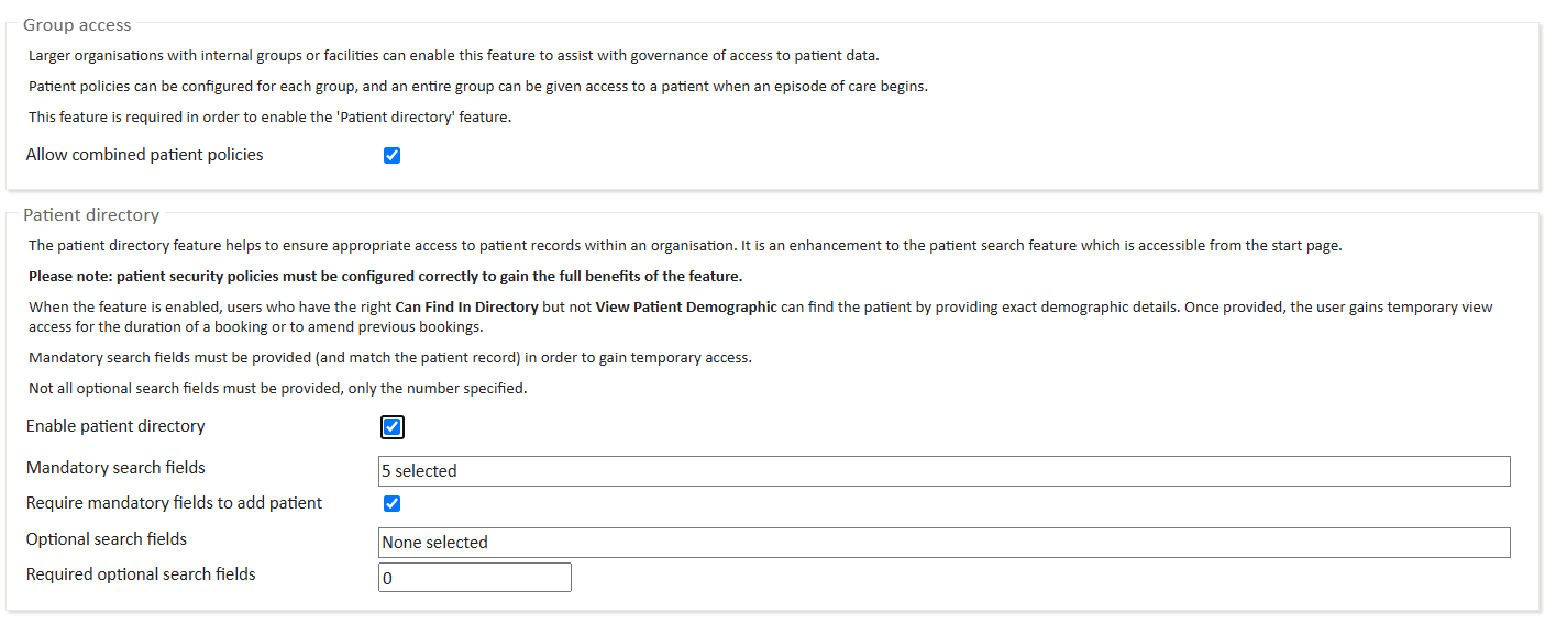 The Combined Patient Policies feature is also required to enable the Patient Directory Search feature.