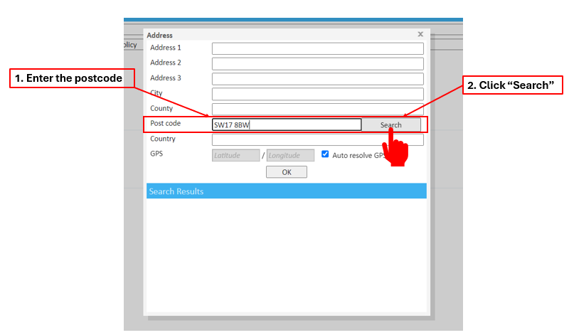 Step 2: In the postcode text box, type in the postcode then press the "Search" button.