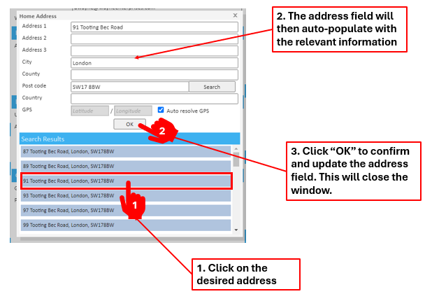 Step 5: Once the form has populated, check the address is correct then click "OK".