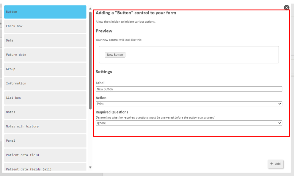 Required questions allow you to ensure clinicians are answering important questions. You will need to add a button to help enforce this. Buttons have a setting which allows you to determine whether Required Questions must be answered before the action can proceed.