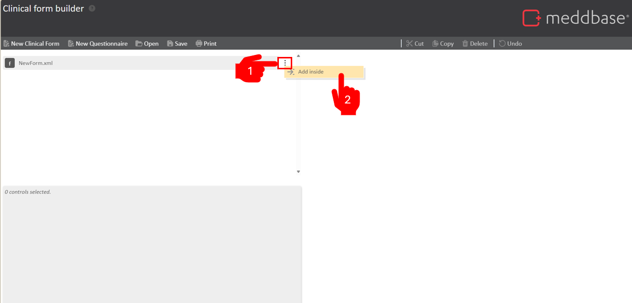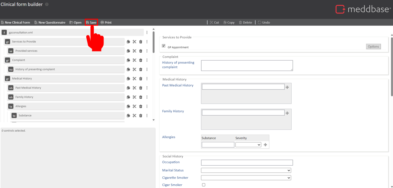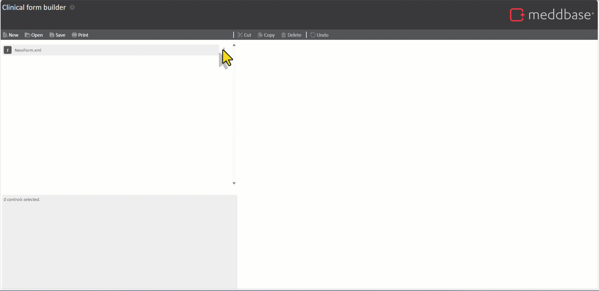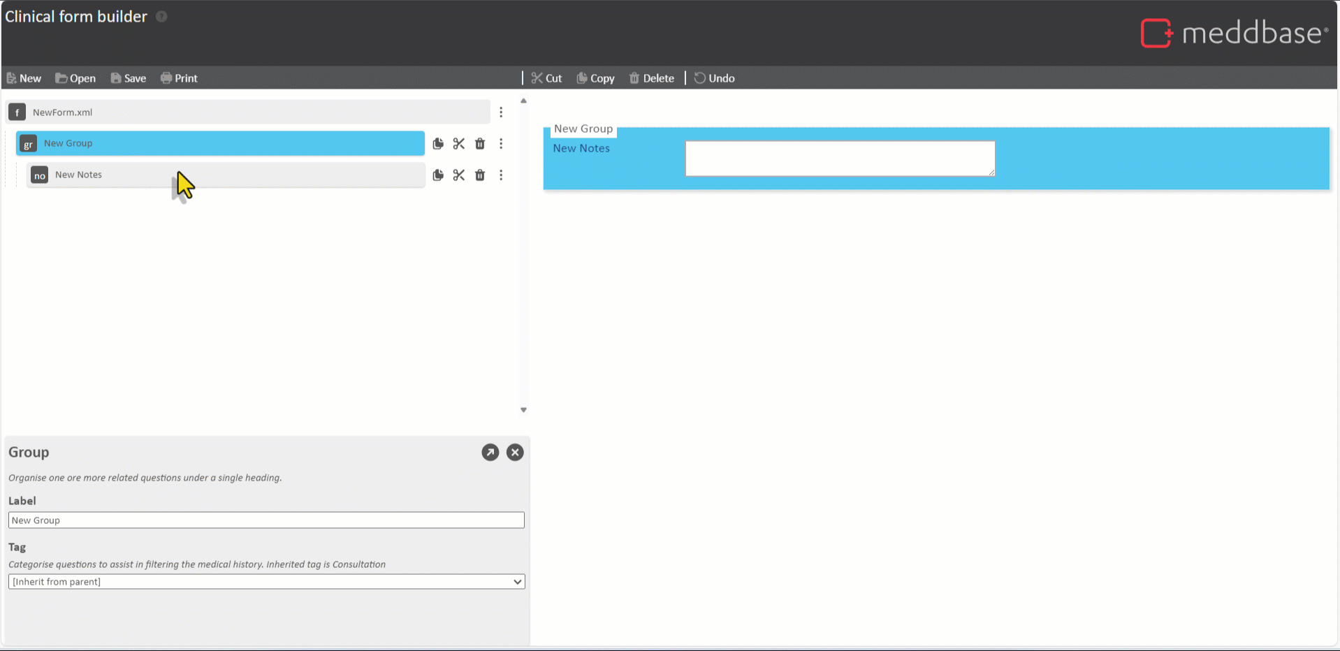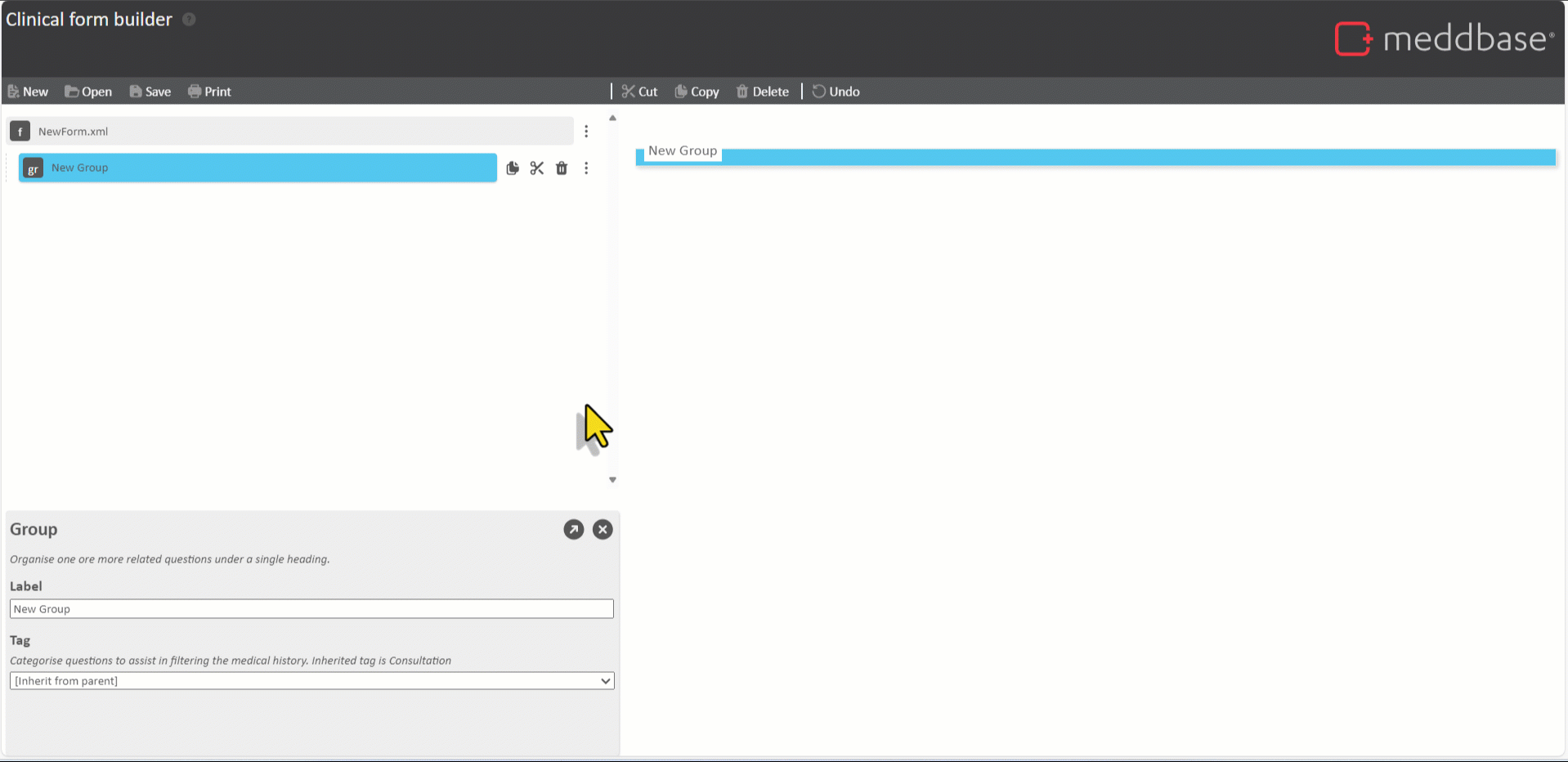 1. New Clinical Form- Start a new Clinical Form - this will wipe any existing Clinical Form in the Builder. Article here: How to use the Simple Clinical Form Builder – Meddbase Help Center