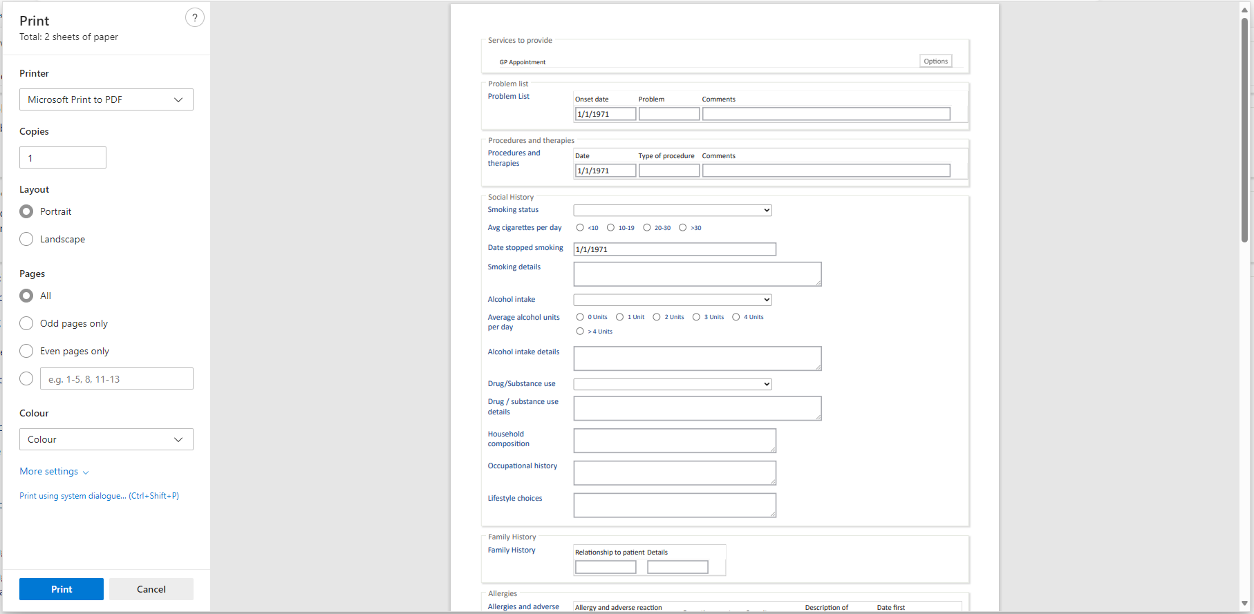 On the tool bar, there is an option to Print the Clinical Form. This will open the Print dialog window, where you can save the Clinical form as a PDF to your device.
