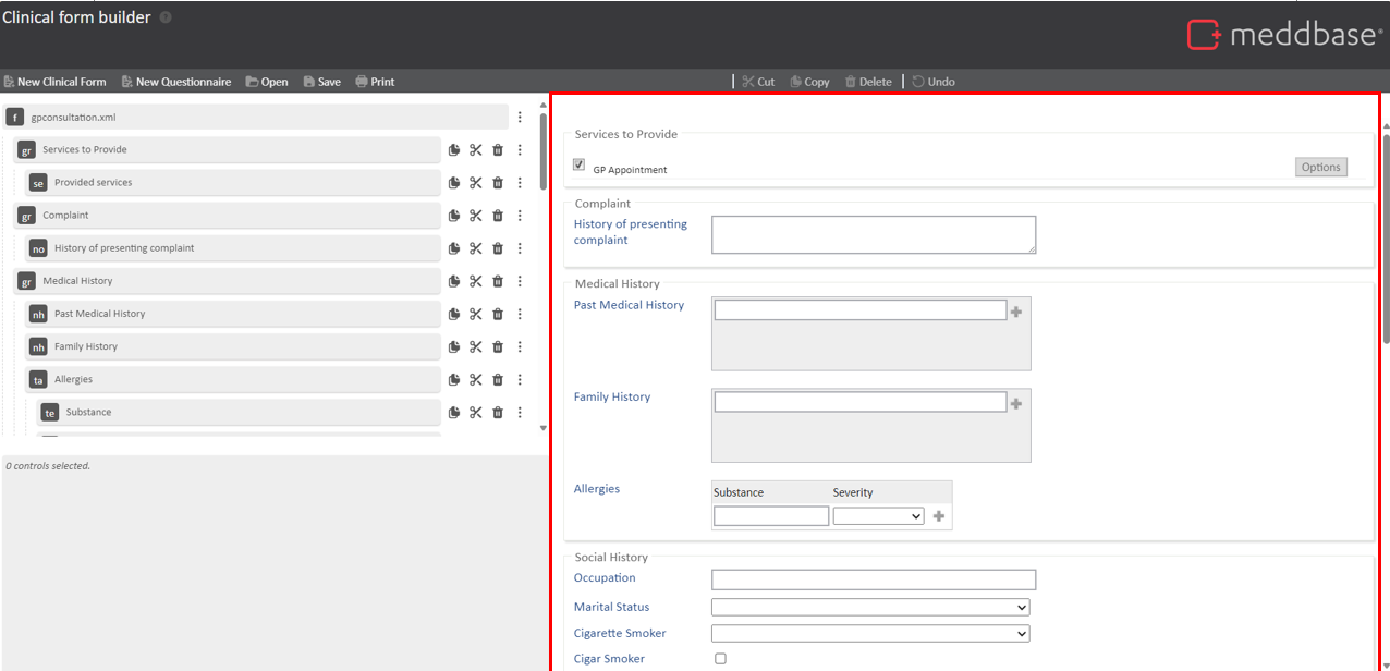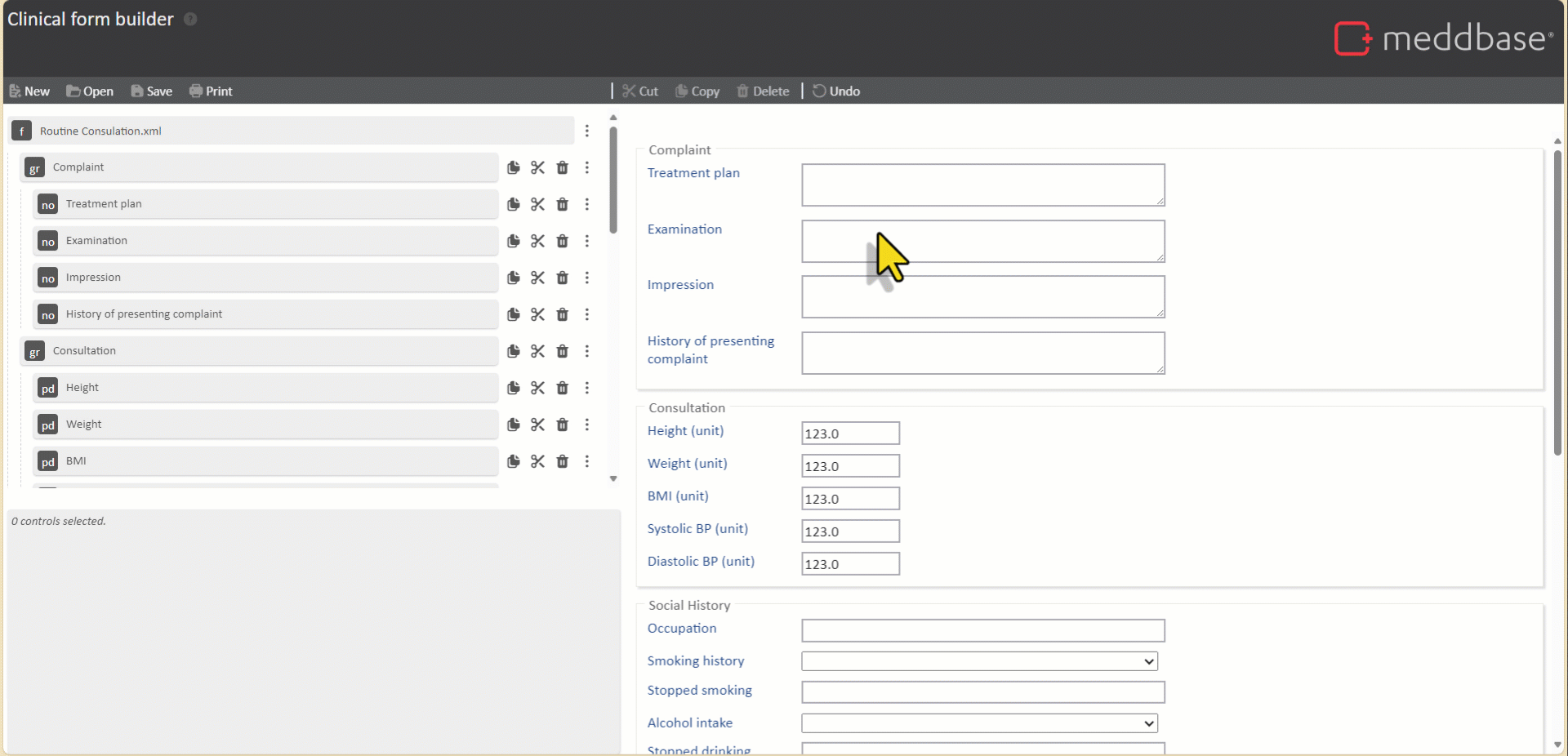 Top tip: It is good practice to organise controls of a similar nature into groups. This helps to divide the clinical form into clear, distinct segments that are aligned to sections of the patient's medical record.