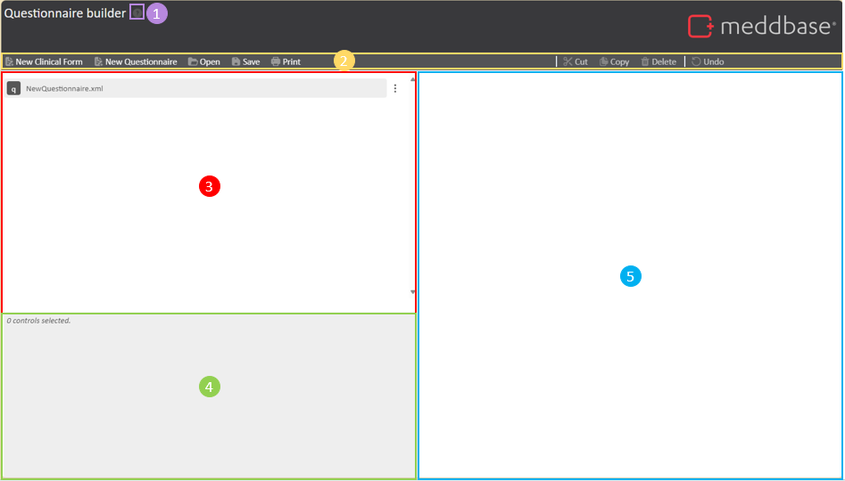 Screenshot of the Meddbase Questionnaire Builder interface with five main sections numbered for reference. Section 1 (purple) shows the Questionnaire Builder title, Section 2 (yellow) displays toolbar options such as New Clinical Form, Open, Save, and Print. Section 3 (red) lists the file structure with 'NewQuestionnaire.xml' visible. Section 4 (green) indicates the area for selected controls, labeled '0 controls selected.' Section 5 (blue) provides the main workspace area for building the questionnaire.