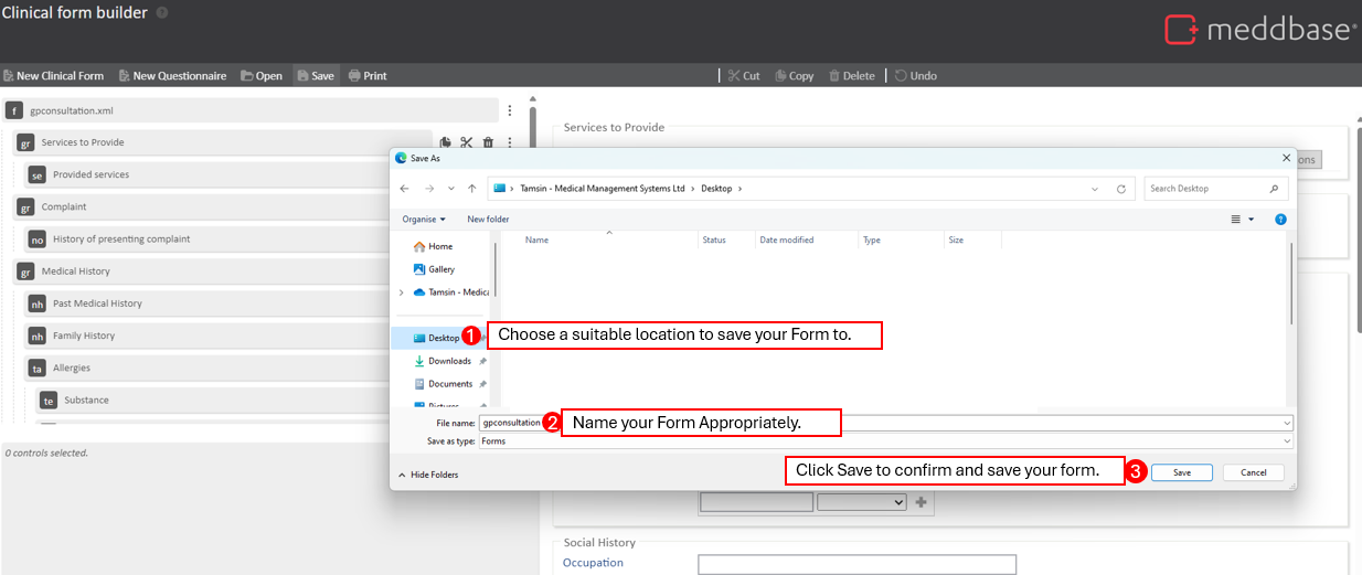 Now you have created your form, you will need to save your form as a file to your computer. Then you will need to raise a Support ticket, asking the team to upload your new Clinical Form. From there, your form will be uploaded this into your Chamber ready for you to use.