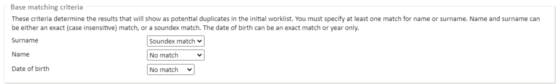 These criteria determine the results that will show as potential duplicates in the initial Worklist. You must specify at least one match for name or surname. Name and surname can be either an exact (case insensitive) match, or a Soundex match. The date of birth can be an exact match or year only.