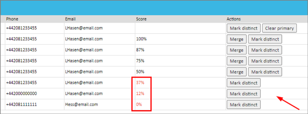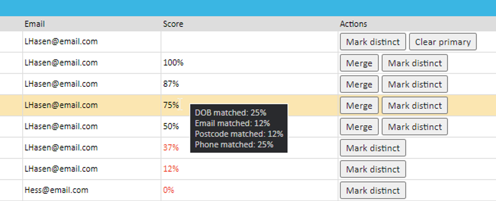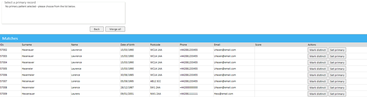 - Only one patient can be marked as primary and selecting this will cause their details to be displayed in an info box at the top of the page, and also scores to appear for other records in relation to how many details they have that match the primary patients.