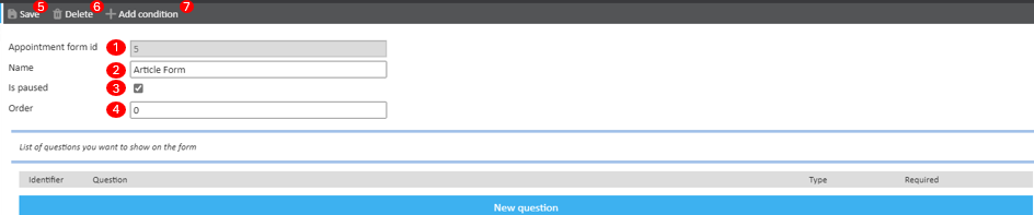 - Order: This can be any number from 0, up to a maximum of 10 digits. If the order is left empty, the order is set to 0 by default. More than one form can be used for Booking Questions, so we use the order number to determine which form comes first. If more than one form share the same order number, the order is then determined by the Appointment Form ID ascending.