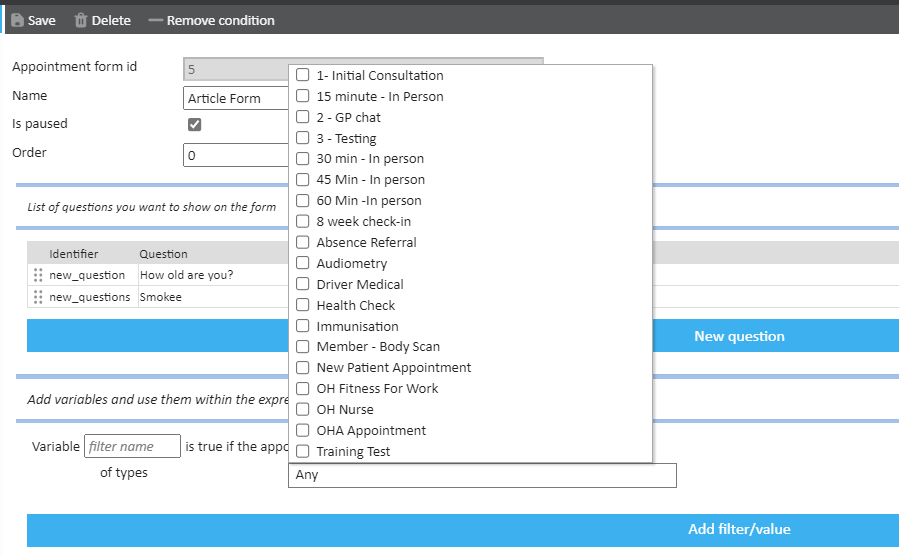 Filters are only available where you have conditions specified. On some occasions, you may want to have specific questions show only for specific appointments or when certain conditions are met. When this is the case, we use the Add filter option to determine which conditions have to be met for specific forms to show.