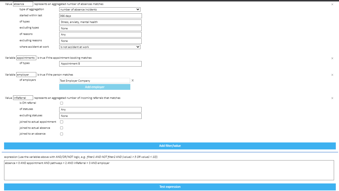 For example, using the variables from the screenshots above we could write an expression that checks if a patient had at least one number of absence incidents in the last 366 days of type Stress, anxiety, mental health, and we were booking Appointment B and patient has more than 2 Pathways and their employer is Test Employer Company and they have more than one incoming referral, then load questions from Appointment Form form. The expression would be: