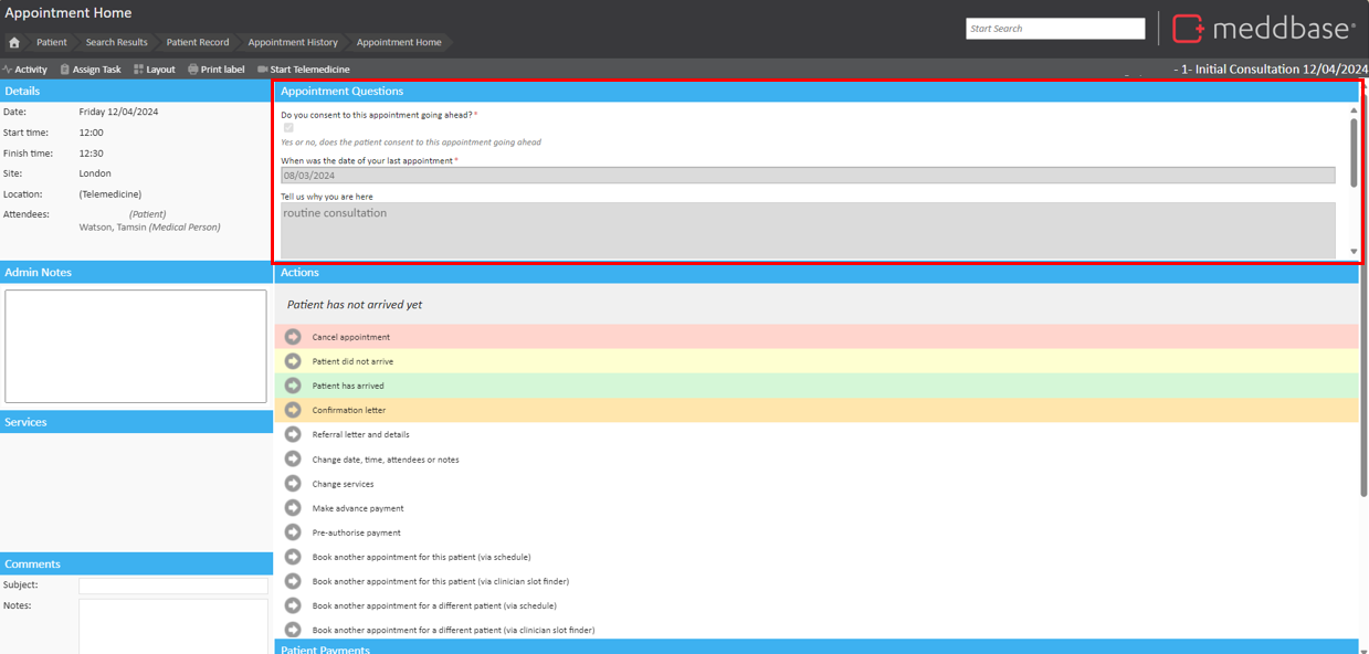 Once the booking questions have been provided and the appointment has been booked, with the answered Booking Questions, these are now populated within the Appointment Home Page.