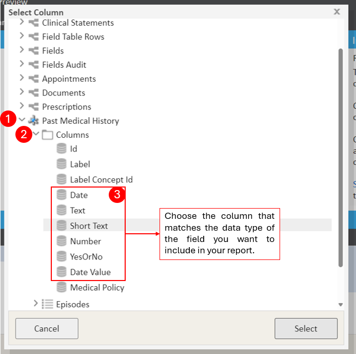 - Select the relevant column dependent on the data type held within that field: Text, Short Text, Number, YesOrNo or Date Value.