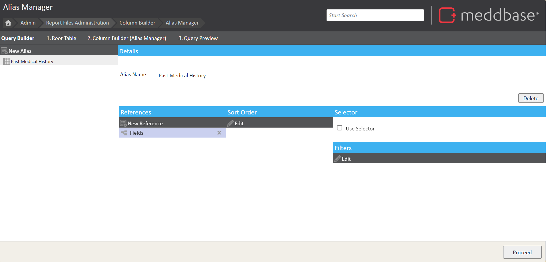 In the example below, an Alias has been created and named"Past Medical History" and the alias references the Fields table.