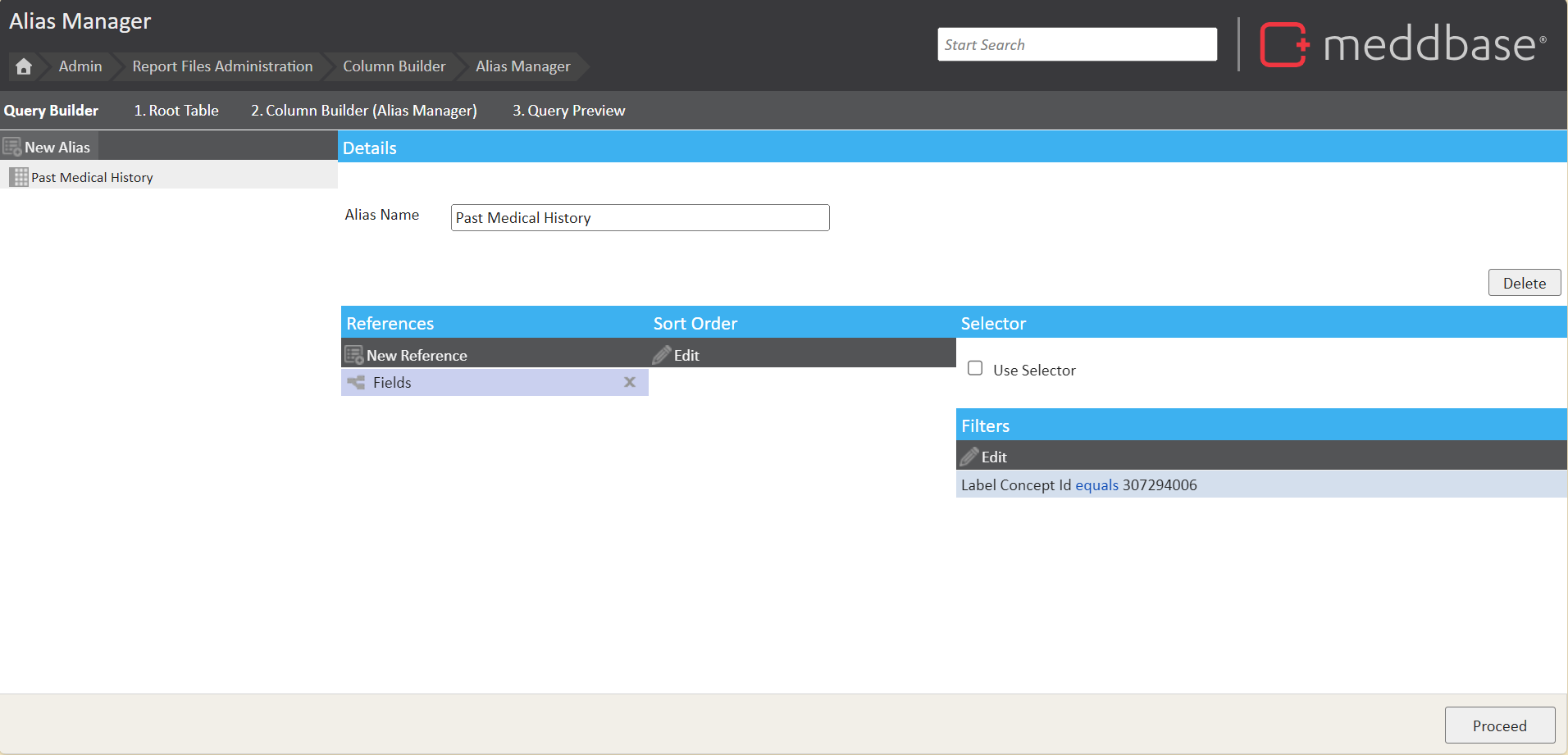 In the example below, the "Past Medical History" alias references the Fields table and includes a filter on the Label Concept ID, which in this case is 307294006.