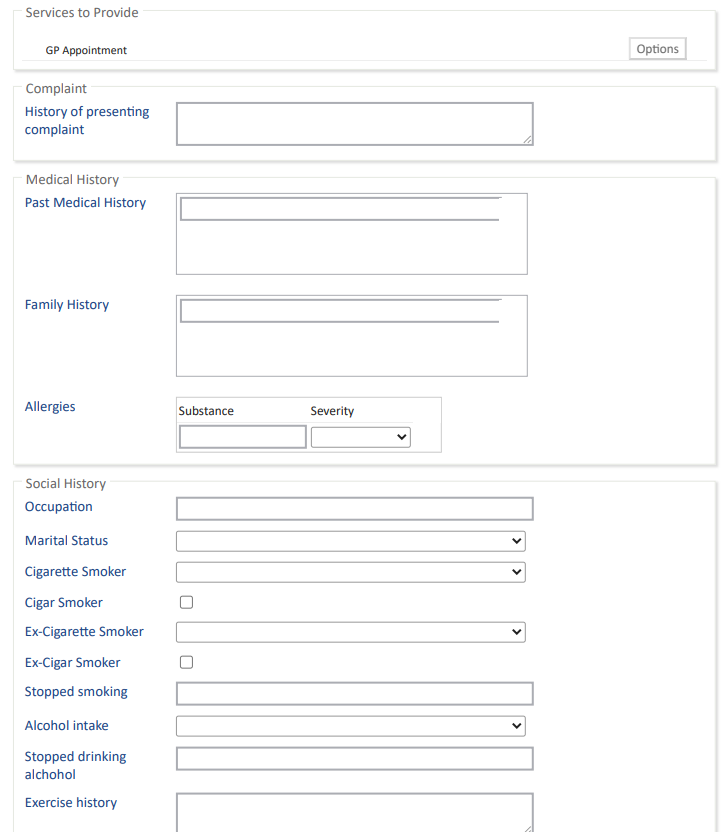 Clinical Forms are accessible during a consultation and are used to document findings related to that consultation. Specific Clinical Forms can be linked to appointment types, ensuring that when an appointment of a particular type is marked as "arrived," the corresponding Clinical Form automatically appears. Each clinical form consists of various fields that autosave the information entered directly into the patient's medical history.