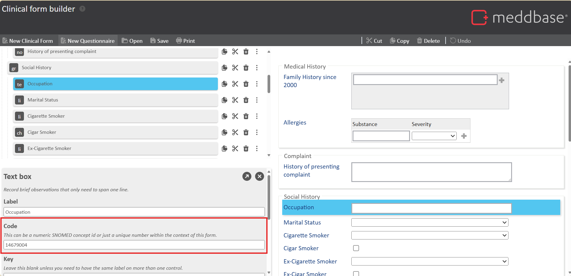 Every question in a Clinical Form will have an associated Concept ID, also known as the code. These codes are unique to what you have defined them to be. This is the identifier for this question. You will need to know the Concept ID of the CF fields you want to include in your report. An example of what a Concept ID looks like can be seen in the screenshot below, this is a snippet taken from the Form Builder.