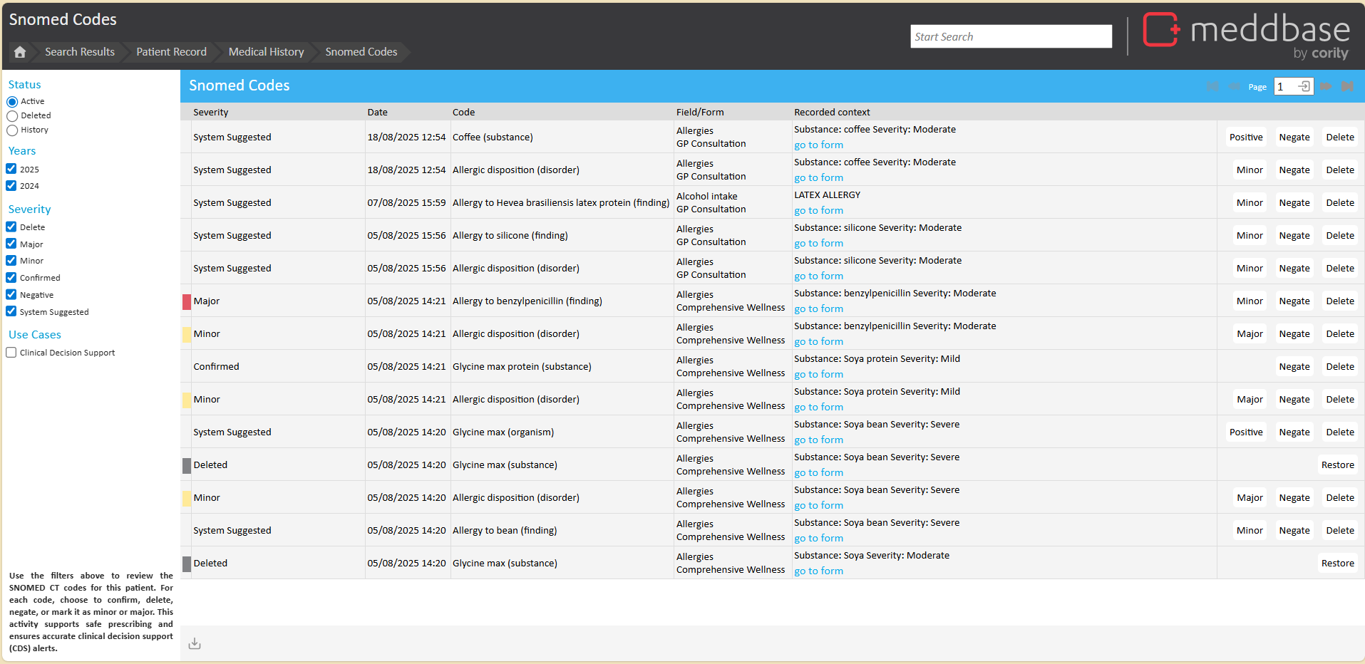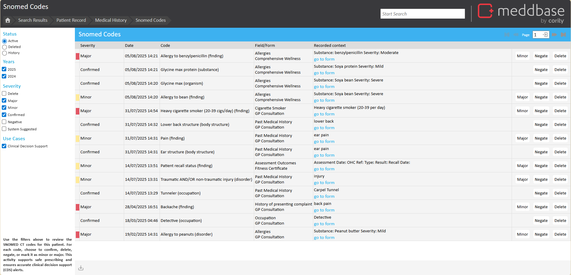 The SNOMED Review Screen in Meddbase provides a central place to view and manage all SNOMED CT codes associated with a patient’s record. It allows users to easily review and manage these codes without needing to go into each appointment or clinical form. From this screen, users can take actions such as confirming, negating, or deleting codes.