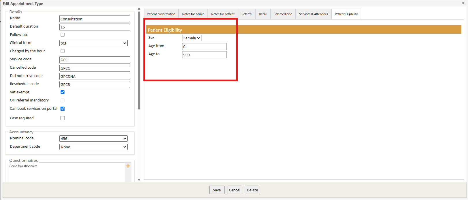 The 'Patient Eligibility' tab allows you to configure eligibility criteria in order for a patient to be booked in for this appointment type.