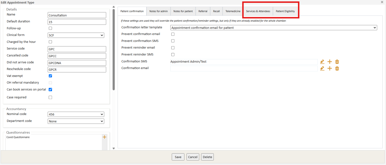 The 'Services & Attendees' tab allows you to automatically add individual services and attendee specifications to the appointment type as required.