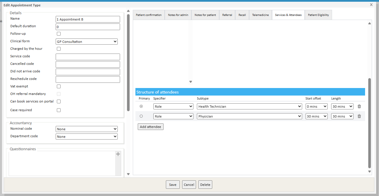 - A 2nd attendee is based on the role group "Physician", where the start offset is 30 minutes and the length of attendance is 30 minutes.