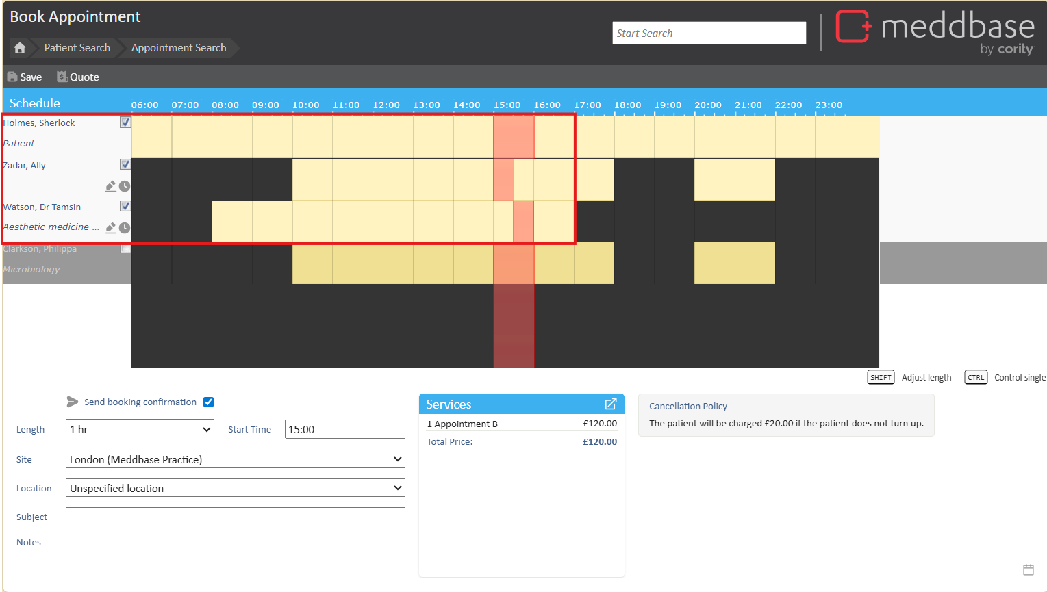 When you select a slot and proceed to the booking confirmation page, you may notice that Meddbase has automatically selected a second attendee, based on the criteria we set in the appointment type.