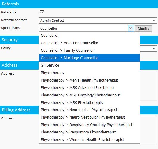 Then the specialisms will also need to be set. This is where the specific specialisms that the company chamber wants to accept are set. This would then restrict what type of referrals the chamber company could receive.