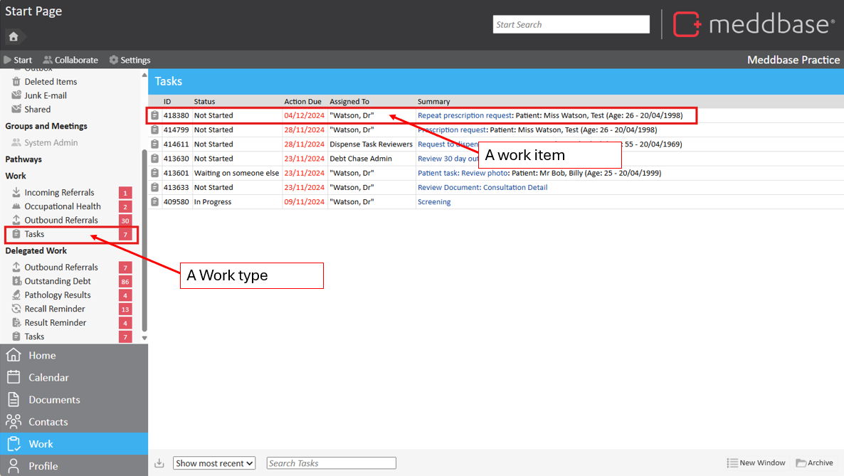 Each work item type in Meddbase—such as Tasks, Recalls, Pathology Results, Debt Reminders, and PACS—has its own set of rules and structures that govern how it operates. These rules define the processes and workflows associated with each work item.