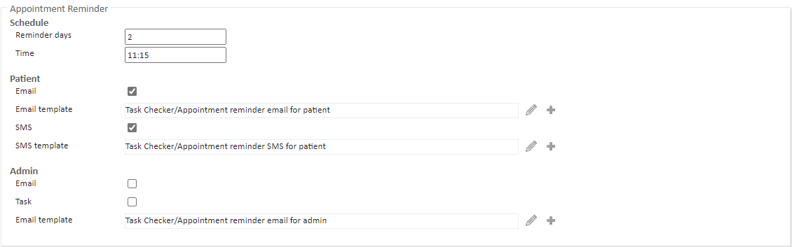 To configure this feature, go to Admin > Configuration>Task checker. In this area you will find all settings and templates used for appointment confirmations, reminders, recall reminders, birthday reminders, service reminders and questionnaire reminders.