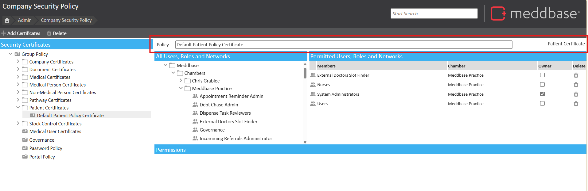 Security Policies govern different aspects of data security in Meddbase. Each policy type (or certificate) governs a set of user permissions.