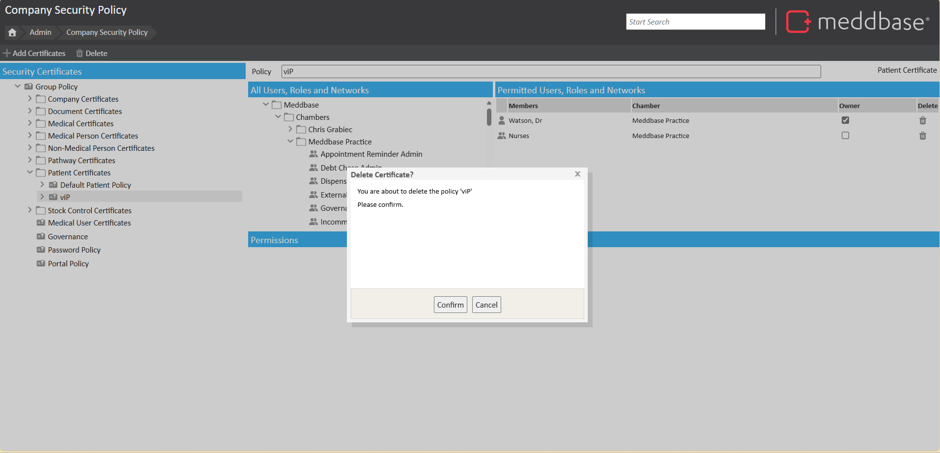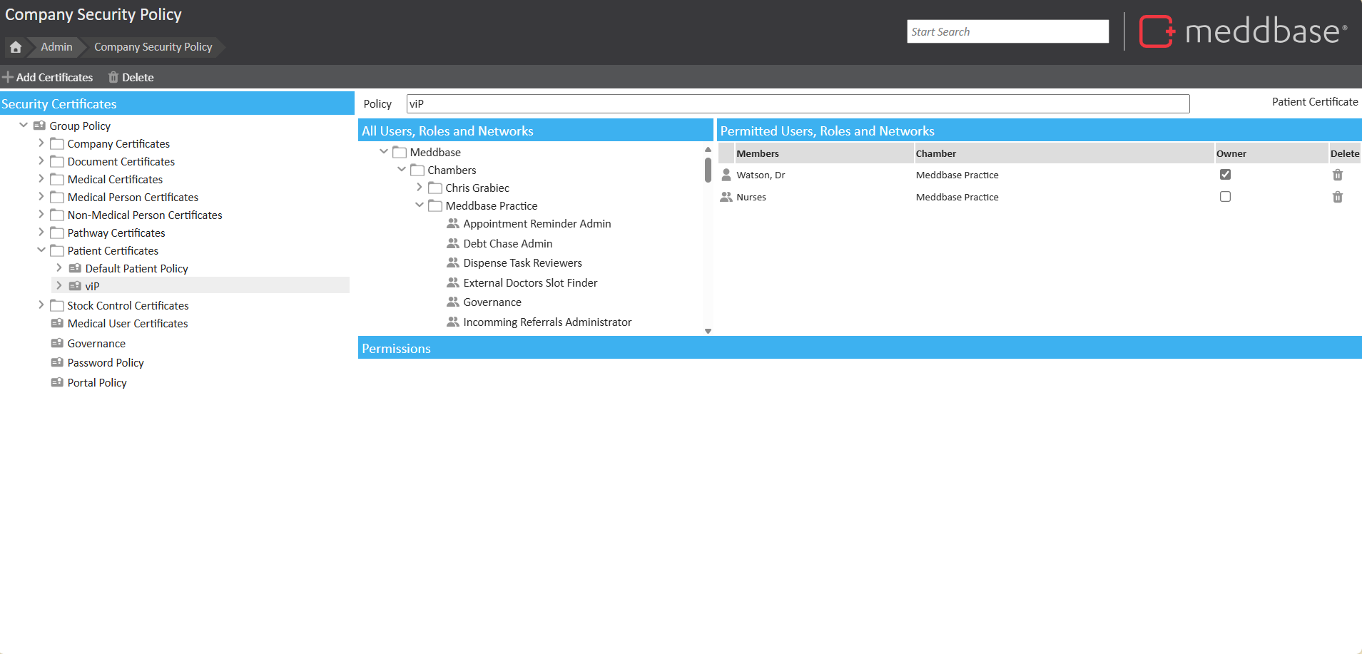 Security Policies govern different aspects of data security in Meddbase. Each policy type (or certificate) governs a set of user permissions.