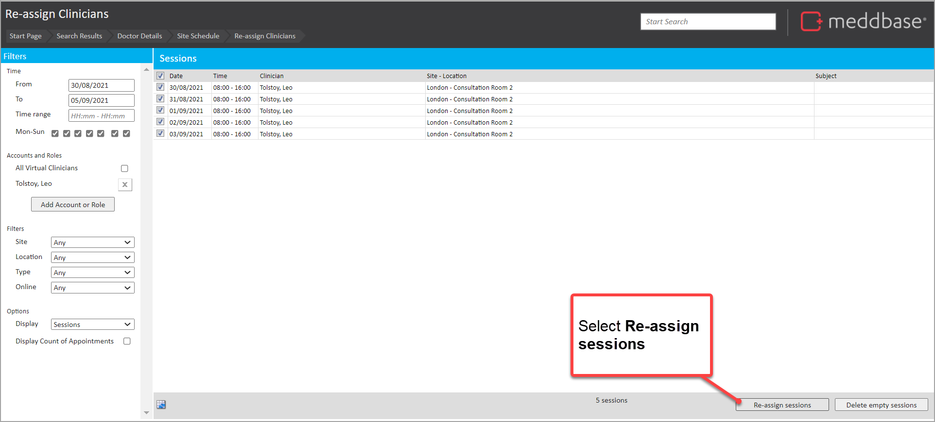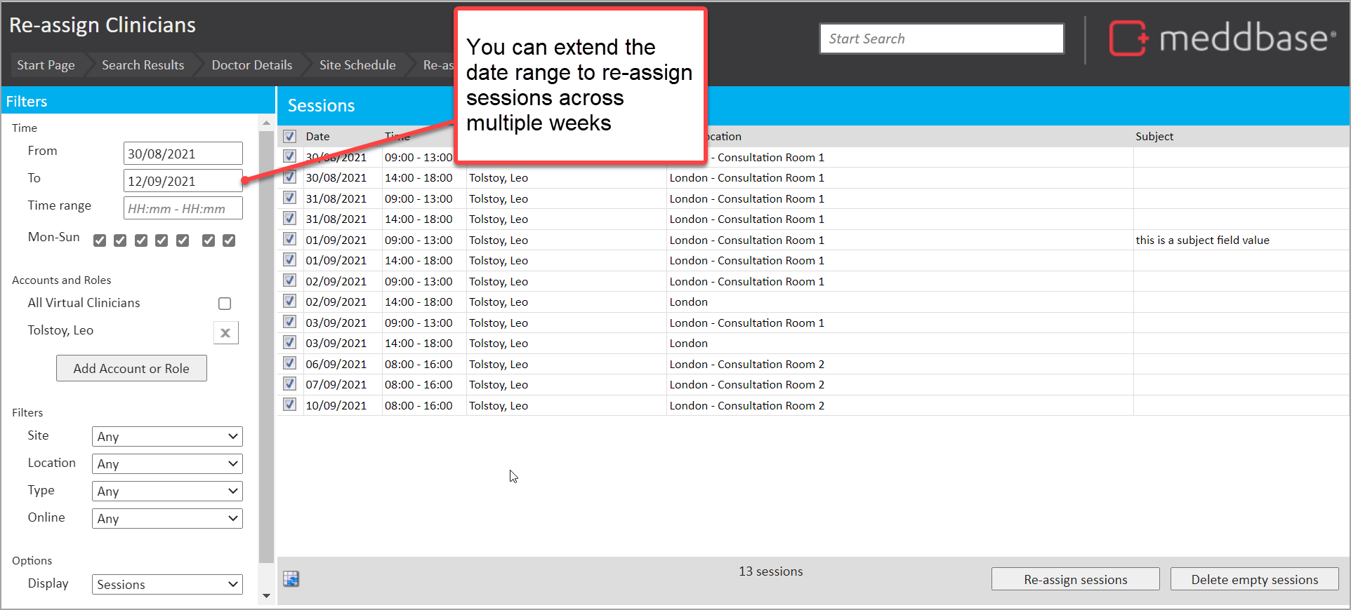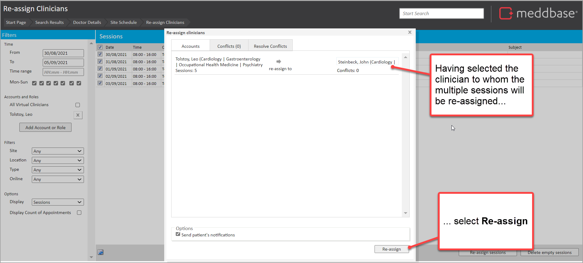 In order to manage large re-scheduling tasks, Meddbase enables you to re-assign multiple sessions from one clinician to another.