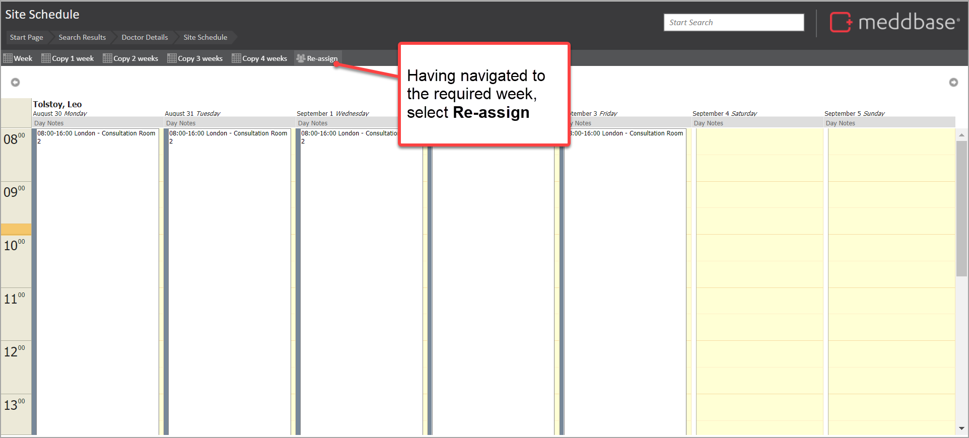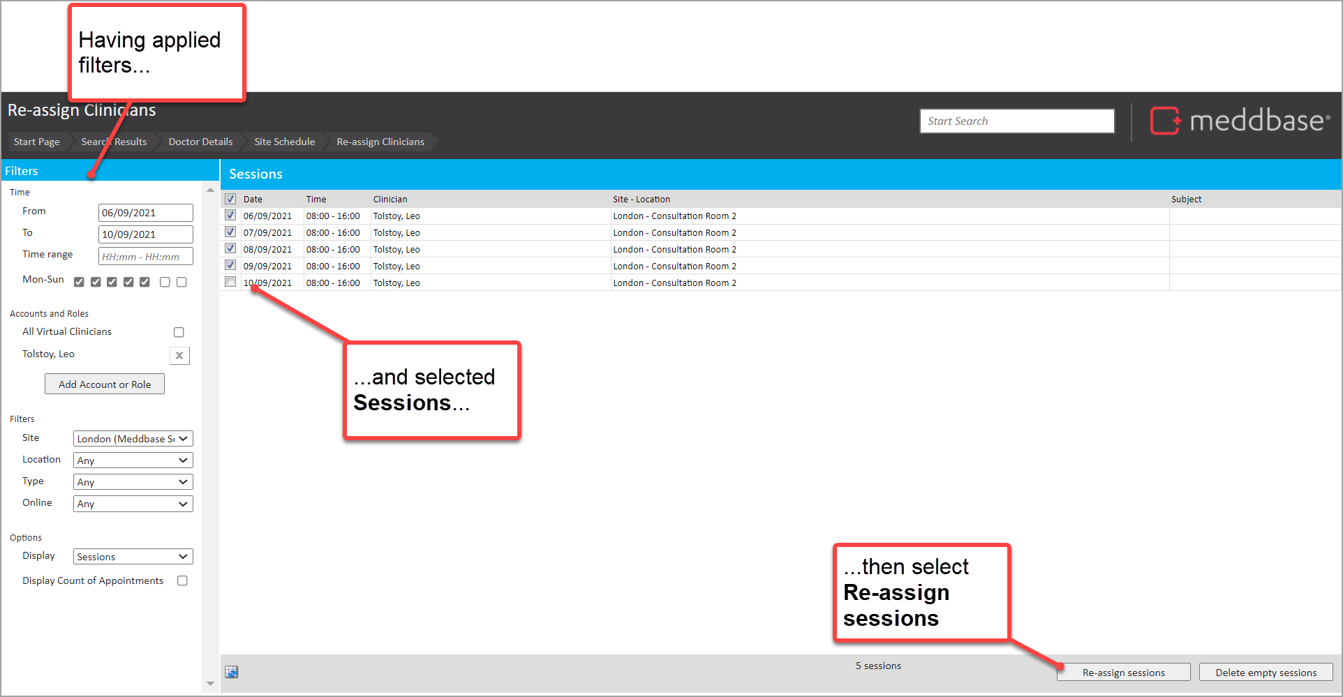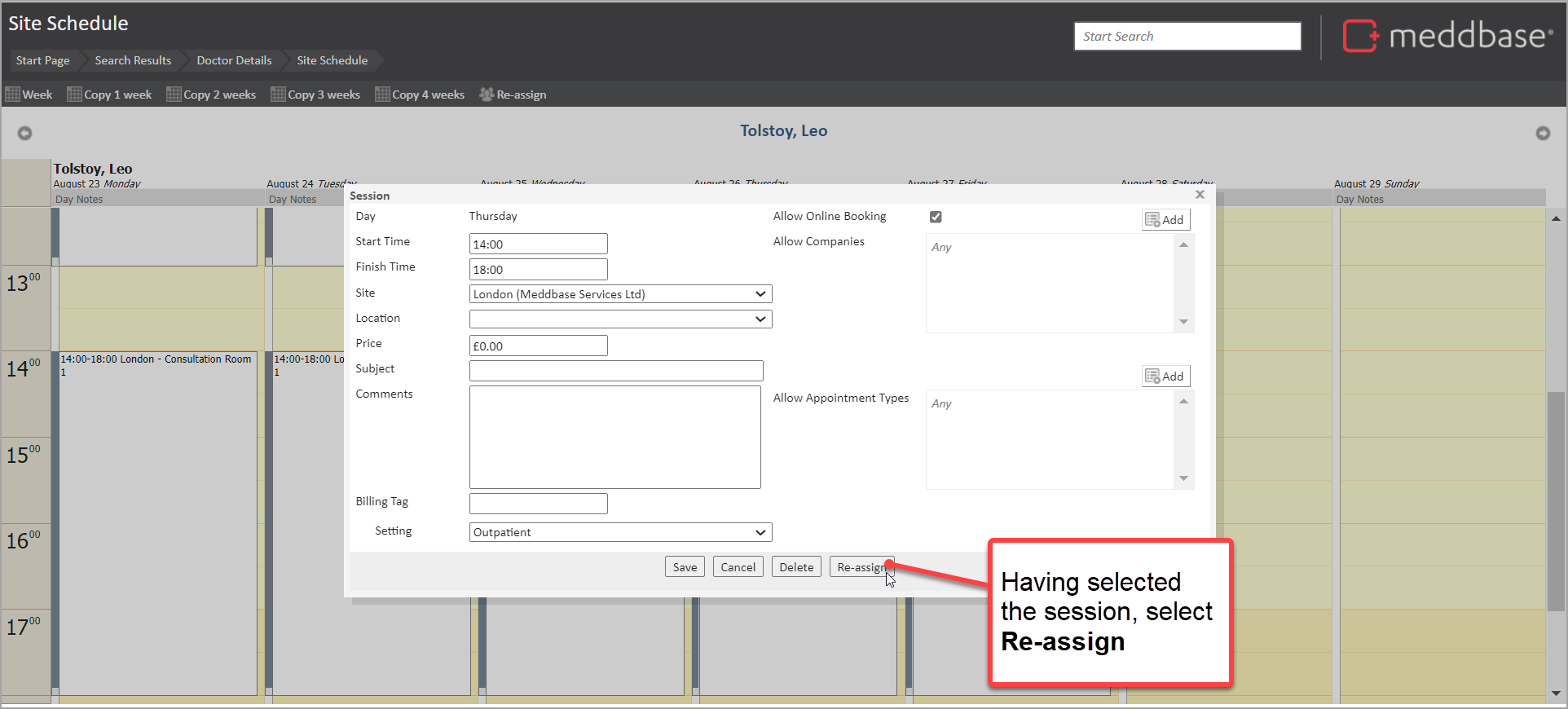 In order to manage large re-scheduling tasks, Meddbase enables you to re-assign multiple sessions from one clinician to another.