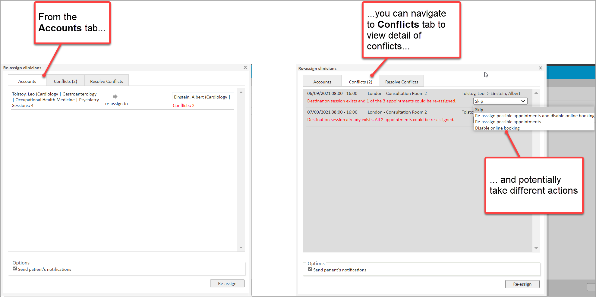 The count of conflicts is shown in the Accounts tab of the Re-assign clinicians screen.