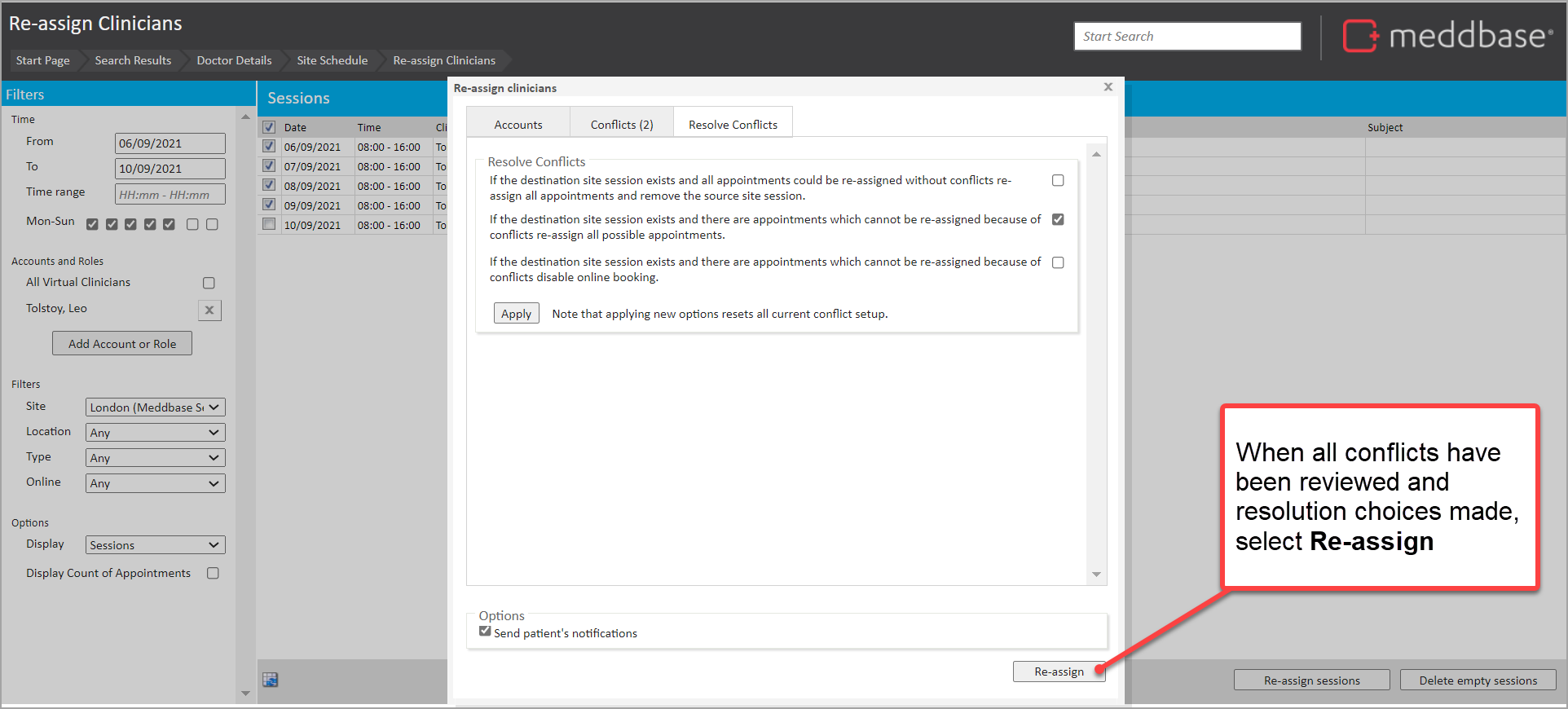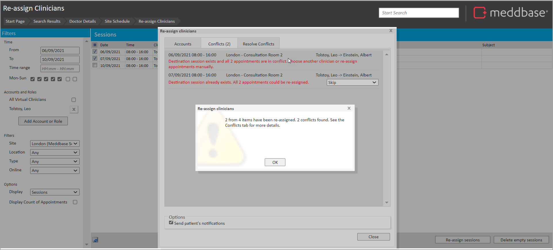 Scenario 2 illustrated a 'happy path' showing no conflicts in the re-assignments. Where there are potential conflicts, such as existing bookings, Meddbase will provide you with a range of options to manage them.