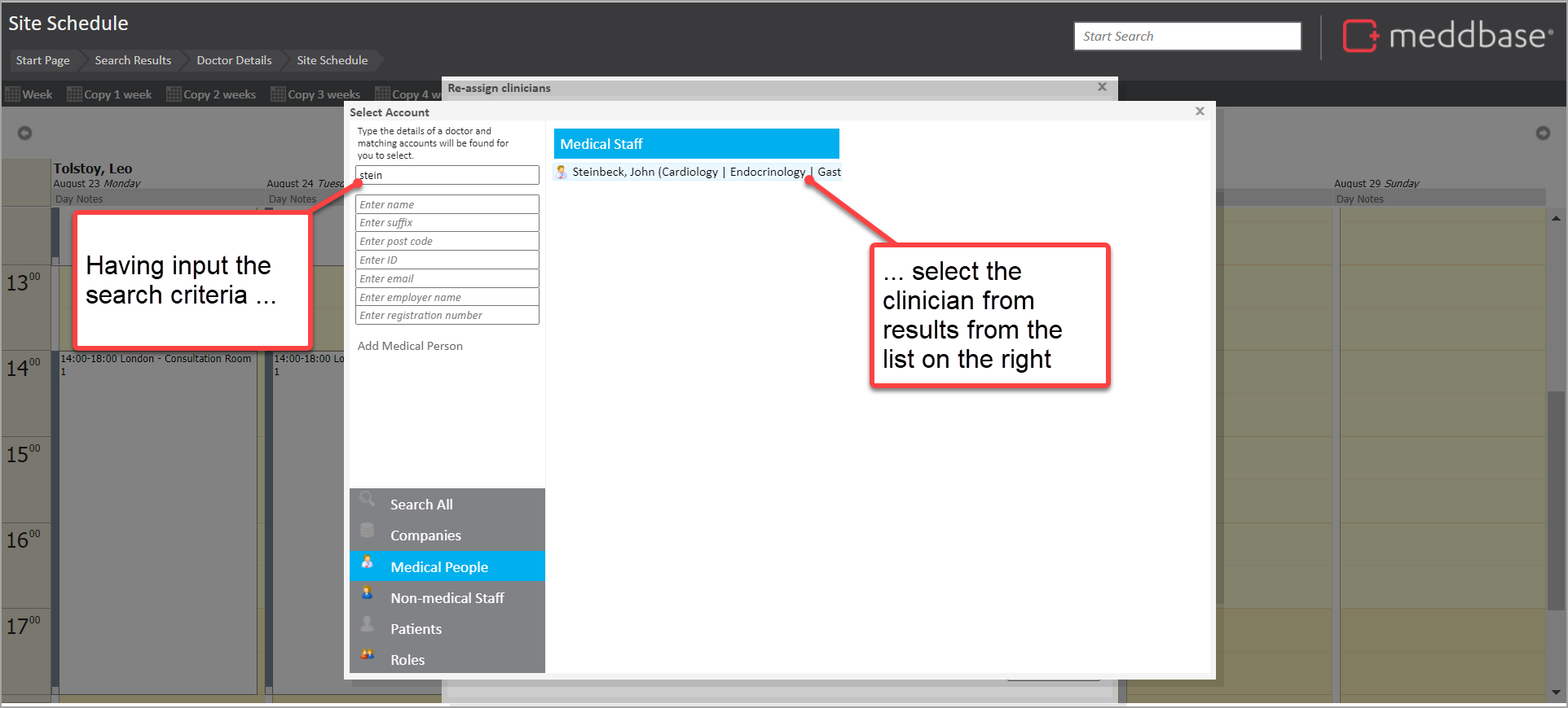 5. Select the required clinician to whom the sessions should be re-assigned (in a similar way to steps 5-6 in Scenario 2 above)