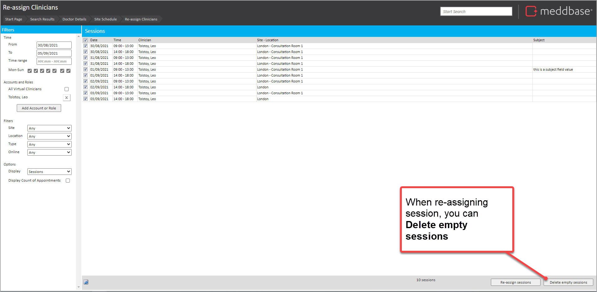From the Re-assign Clinicians screen, you can Delete empty sessions.