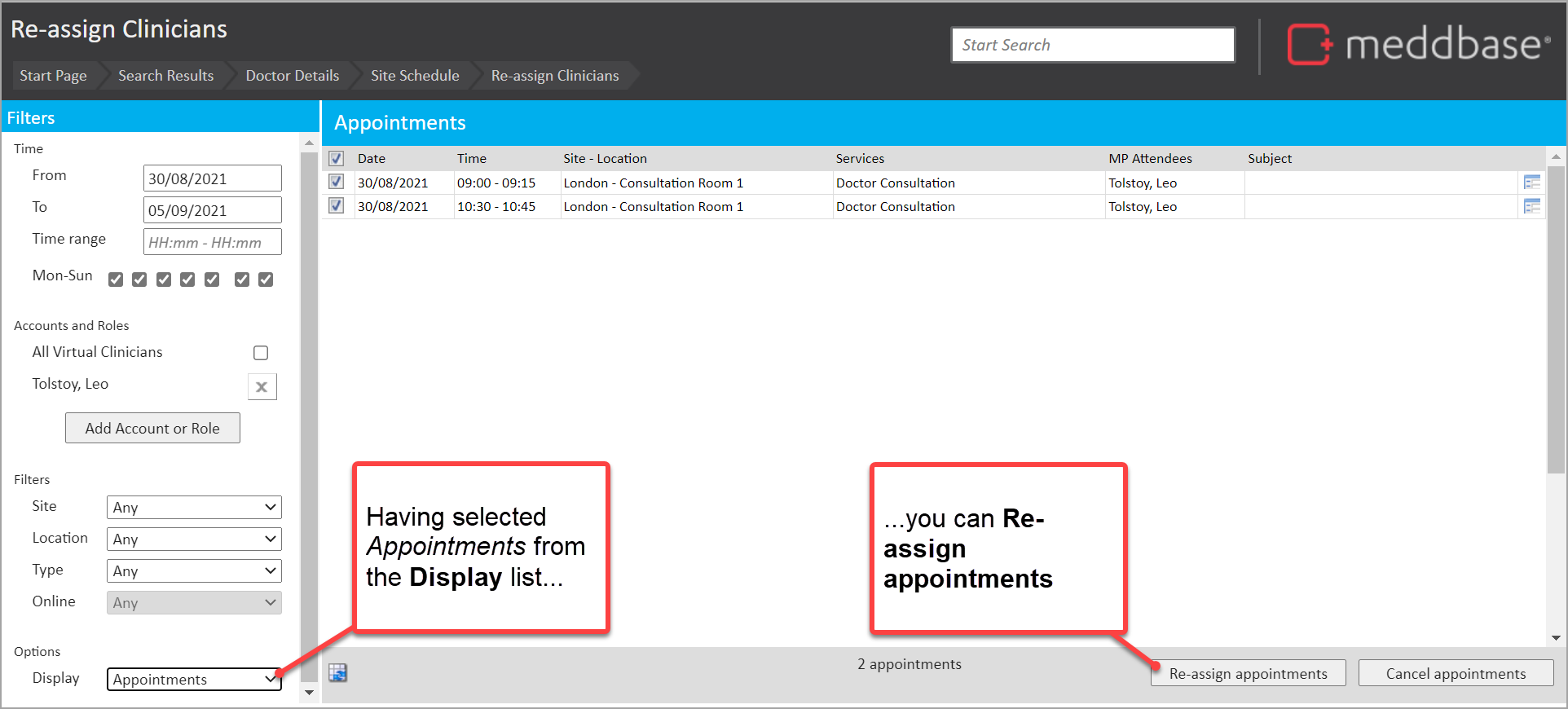 | Display | Choose whether you are re-assigning whole sessions or just individual appointments. |