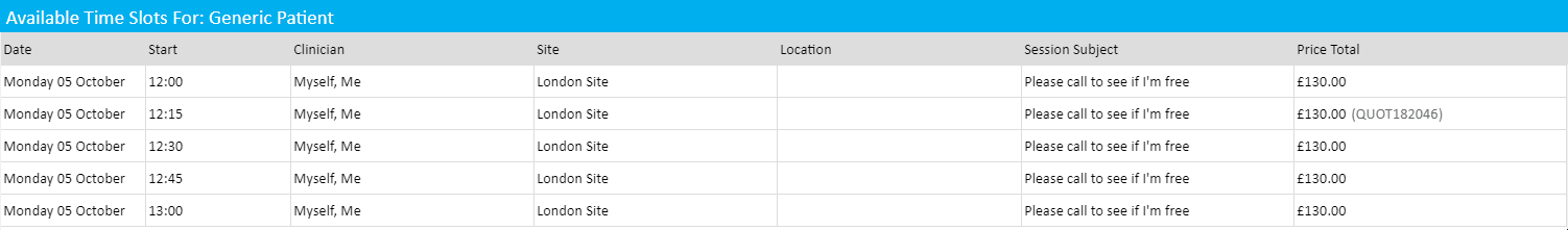 Use the slot finder to search for an appointment by specifying the appointment type, site and clinician to retrieve a list of available appointment slots. Once you have done this, select the preferred slot and click ‘Quote’ in the bottom right hand of your screen to create the quote and display the quote document.