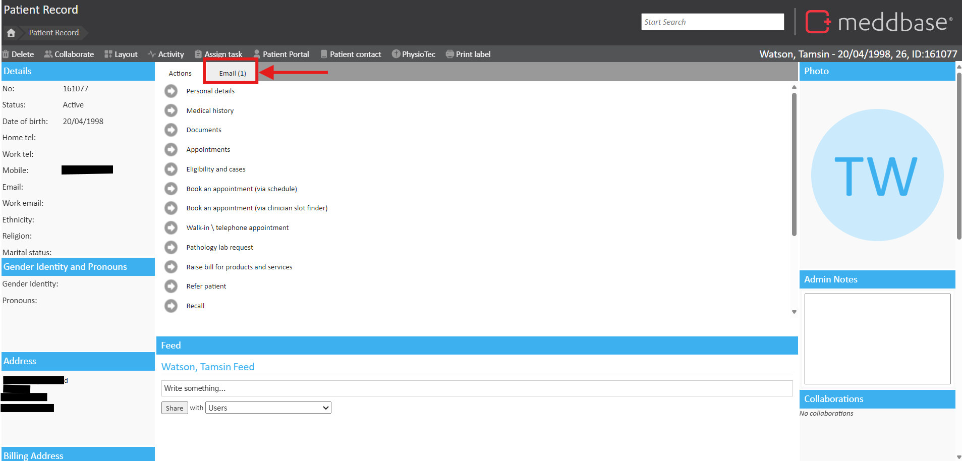 This will add the email to the ‘Email’ tab on the patient’s home page, furthermore, any documents attached to the email will also be attached in this patient’s ‘Documents’ section.