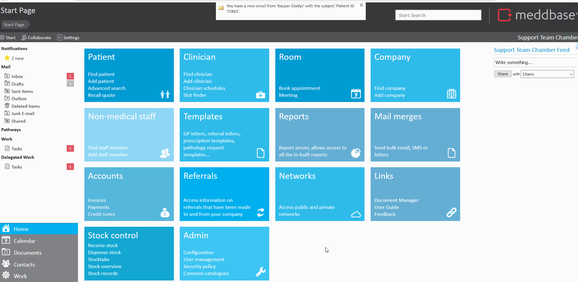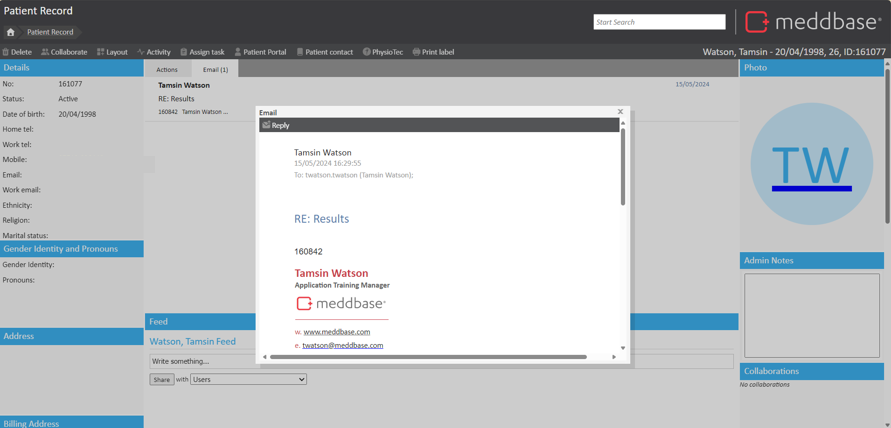 In Meddbase, external emails can be received and linked to a patient record. Once linked, these emails moved to a "shared" inbox, meaning users with permission to view the patient record can access all linked emails. Any documents attached to the email thread will also be automatically added to the patient's documents section.