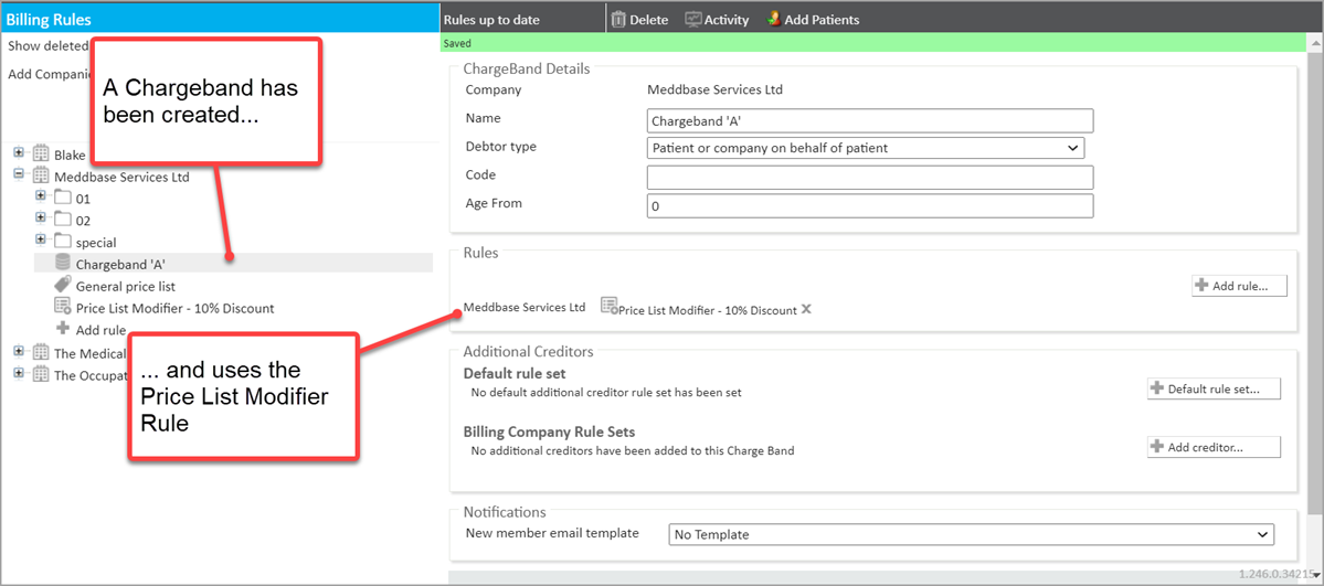 3. A 'Chargeband A' has been created and the Price List Modifier created above has been applied to it.