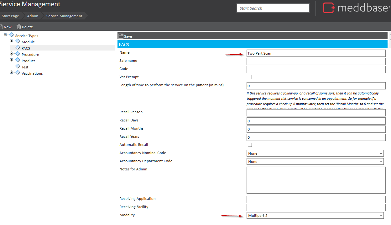 For example, create a new PACS service by going to Start Page > Admin > Service Management and click ‘New’ > ‘PACS’. We will call our new service ‘Two Part Scan’ and select ‘Multipart 2’ as the modality. Once saved we can apply this service to our appointments.