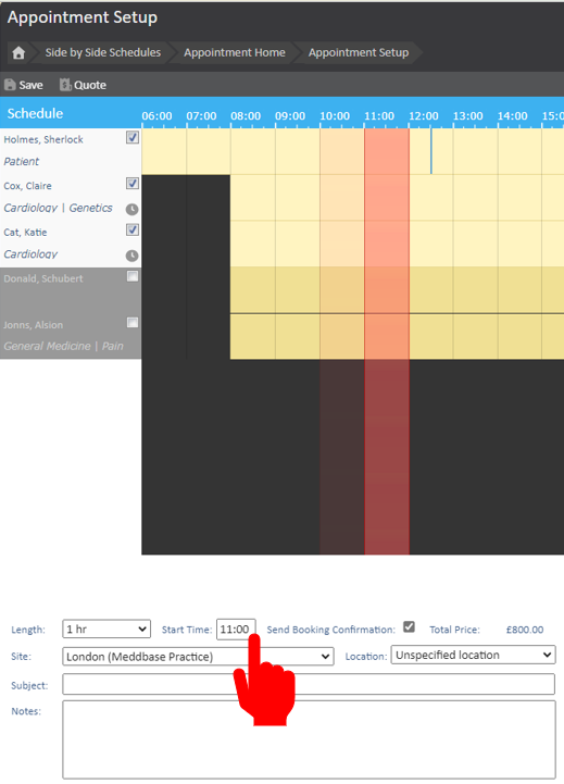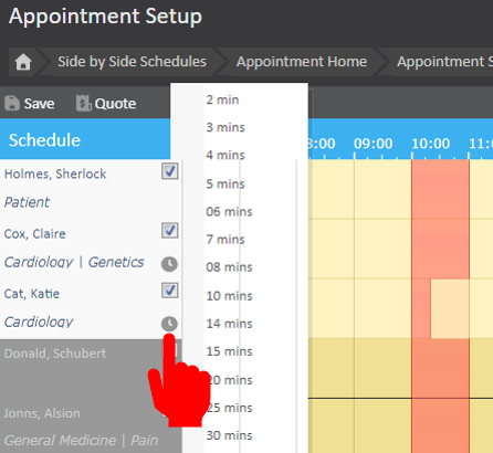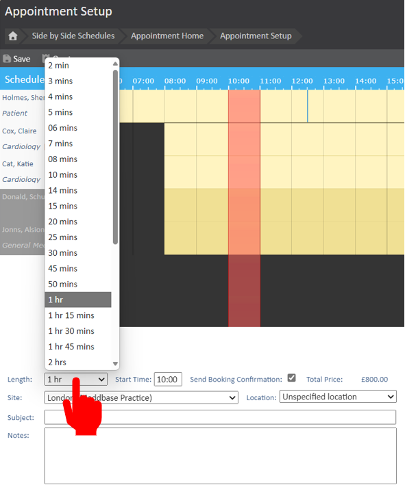 To change the overall appointment length, click the drop-down list next to Length and select the desired length. This will then increase the width of the red bar on the screen to reflect the new duration.