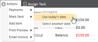 Payments can only be made against an invoice that has been marked as sent. To mark the invoice as sent, click 'Actions' and select 'Mark Sent', using today's date or another date.
