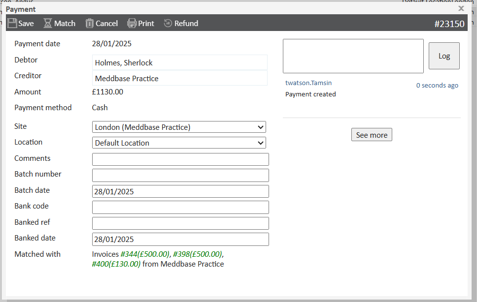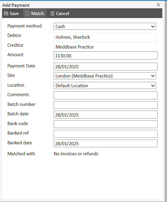 Once the payment has been saved, a new dialog box will appear. Click Match on the top toolbar.